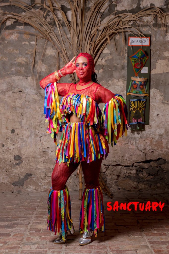 The red fishnet face coverings worn by members of the Sanctuary Troupe during the last Crucian Christmas Festival were an homage to the masquerading traditions in the Virgin Islands, the wider Caribbean and Africa, according to troupe founder Brown. “We held on to the traditions of those who did not want to reveal their identity and presented it in a more evolved, modern way,” she said. “We’re of African descent and we always see pictures of people in traditional dress with face coverings. While I don’t know all the reasons why, I know for sure it is in our DNA.” Brown and friends created Sanctuary to revisit traditional festival masquerade themes in a 21st century frame. Troupe members wore costumes made of madras and other traditionally worn fabric and broad brimmed hats. “Festival is rooted in the community’s desire to showcase politics, protest, sexuality and many other subjects,” she pointed out. She and others wanted to continue the dialogue around recent festival presentations. “Should we just mimic others, or should we explore and express our own identities?” she asked. Sanctuary masqueraders wanted to create “a safe haven for women to express their sexuality,” Brown said. “Our members wanted to celebrate and be comfortably clothed without being oversexualized.” While their numbers, 30 strong, were small by Adult Parade standards, Brown said they were able to share their music with masqueraders and individual entries like “John Bull,” on the route, expanding the scope of their presentation.