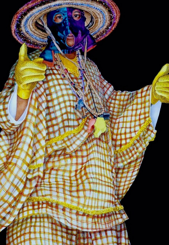 Becoming a moko jumbie was more than learning how to dance on stilts, said John. The moko jumbie tradition came to the Caribbean with enslaved West Africans. Practitioners tower over the people at festivals joining the spirits of the past, present and future together in ritual. He felt transformed once up on stilts. “I felt connected to my ancestors. A spiritualism comes over me and I become a part of the life of the people. I am nervous, apprehensive and encouraged.” While he does not judge those moko jumbies who dance shirtless and maskless, John says he upholds the tradition of covering and masking. His wife Corliss Solomon John, herself a dancer and tradition bearer creates and sews his outfits. They discuss materials and themes, making sure that they represent the spirit of the people. “Moko jumbies are up high and masked because they represent the powers of the Divine,” he explains. “That is why they cover themselves and do not show their human face. The lesson from the ancestors is that there is life, and there is life after death. We are sure about this life, but not absolutely sure about life after death. The mask represents what we do not know.” John agrees that it is an interesting turn of events that we are all now wearing masks as we navigate life and death issues. “If we want to curtail this pandemic, we all should wear masks for the good of all,” he said. “I wonder about those who feel it means they have to forego their “rights.”