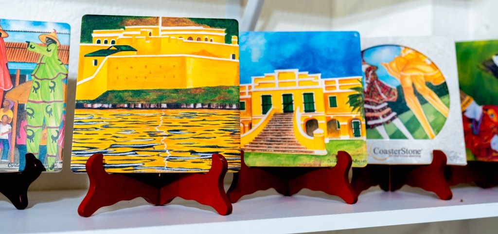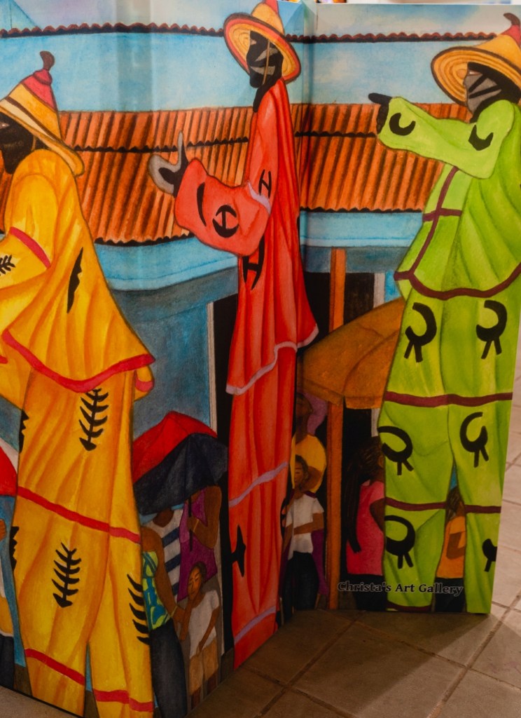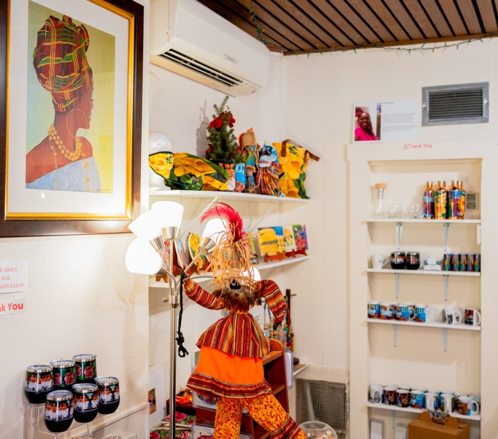 Christa’s Art Gallery at 57 Company Street, St. Croix is filled with the colors of the Caribbean and cultural iconography from roosters to windmills, to children at play. One gets a sense of St. Croix and the Caribbean when stepping inside. Life-size dancers and masqueraders lurk in corners and collectibles from coloring books to shot glasses adorn the tables in the gallery space.